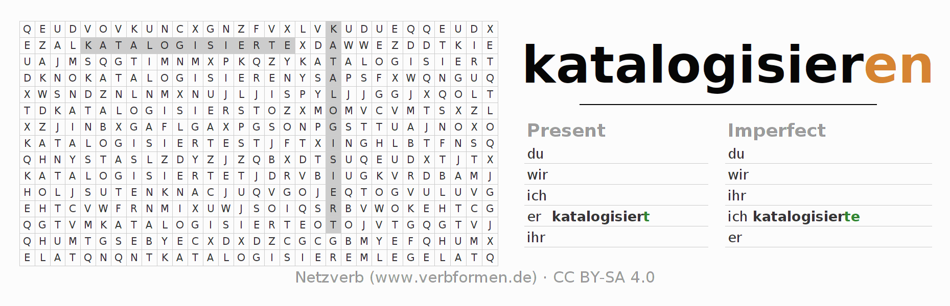 The word search puzzle for katalogisieren or short word search is used to playfully learn German conjugation. First of all, the individual verb forms of the verb katalogisieren must be created in order to find them in the letter grid. The reverse way is also possible. If one finds a flected verb in the search word puzzle, it is necessary to find out which verb form can be assigned. For printing and downloading, there is a PDF version or an image. There are also many more worksheets for the verb katalogisieren. All materials are available as Open Educational Resources (OER) under license CC BY- SA 4.0 and can be used free of charge.