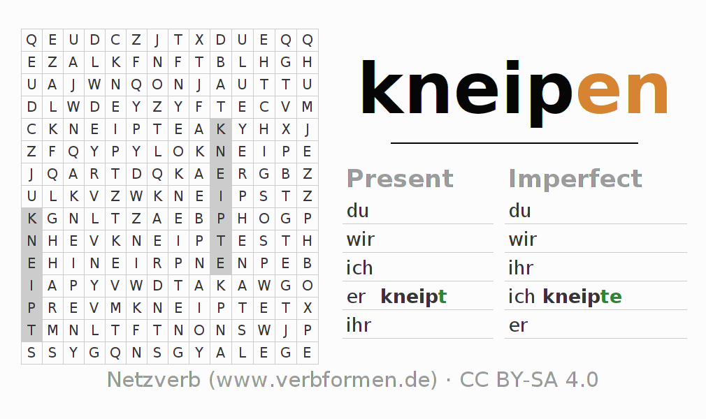 The word search puzzle for kneipen or short word search is used to playfully learn German conjugation. First of all, the individual verb forms of the verb kneipen must be created in order to find them in the letter grid. The reverse way is also possible. If one finds a flected verb in the search word puzzle, it is necessary to find out which verb form can be assigned. For printing and downloading, there is a PDF version or an image. There are also many more worksheets for the verb kneipen. All materials are available as Open Educational Resources (OER) under license CC BY- SA 4.0 and can be used free of charge.