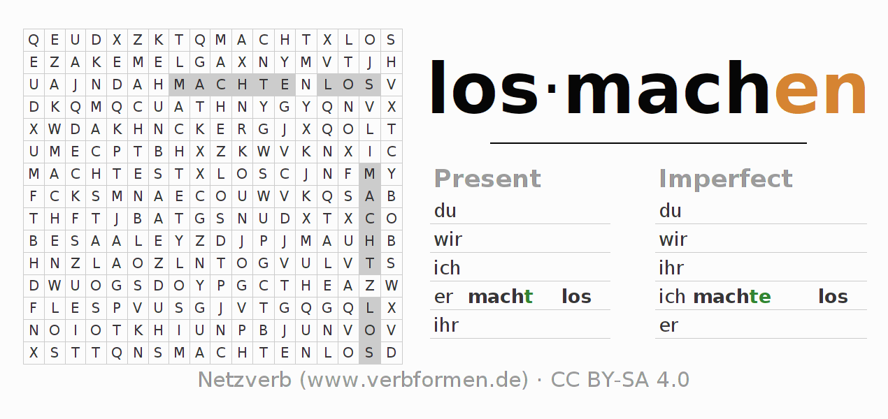 Instruction: Form the verb losmachen and find it in the puzzle. Or recognize the flected form of losmachen in the riddle and assign it to the correct verb form. Umlauts and ß are described as oe, ae and ue an ss.The solution is at the bottom of the page.