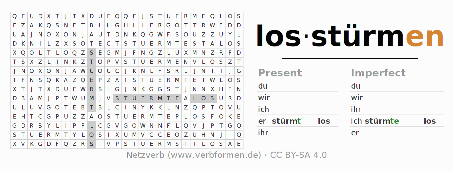 Instruction: Form the verb losstürmen and find it in the puzzle. Or recognize the flected form of losstürmen in the riddle and assign it to the correct verb form. Umlauts and ß are described as oe, ae and ue an ss.The solution is at the bottom of the page.