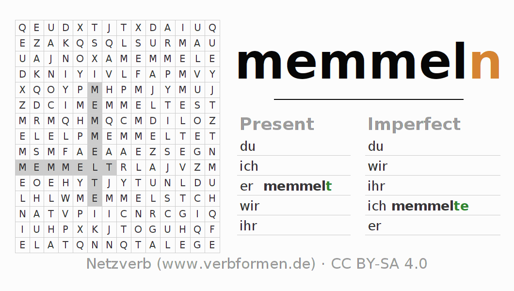 The word search puzzle for memmeln or short word search is used to playfully learn German conjugation. First of all, the individual verb forms of the verb memmeln must be created in order to find them in the letter grid. The reverse way is also possible. If one finds a flected verb in the search word puzzle, it is necessary to find out which verb form can be assigned. For printing and downloading, there is a PDF version or an image. There are also many more worksheets for the verb memmeln. All materials are available as Open Educational Resources (OER) under license CC BY- SA 4.0 and can be used free of charge.
