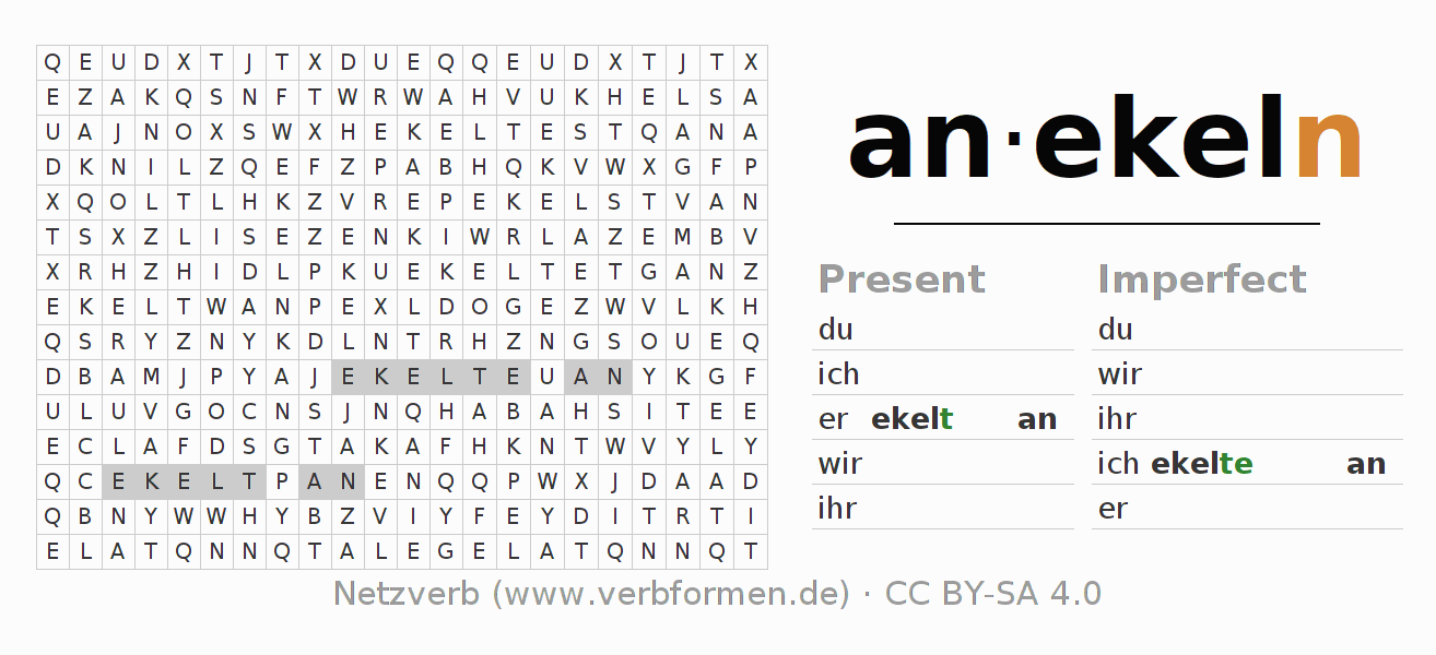 Instruction: Form the verb anekeln and find it in the puzzle. Or recognize the flected form of anekeln in the riddle and assign it to the correct verb form. Umlauts and ß are described as oe, ae and ue an ss.The solution is at the bottom of the page.