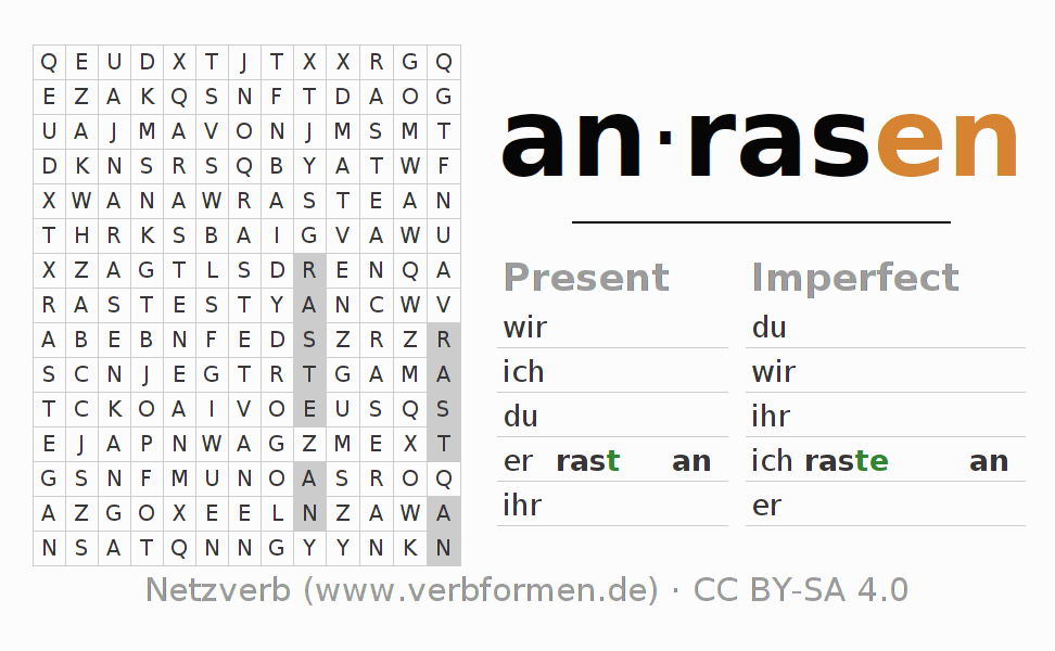 The word search puzzle for anrasen or short word search is used to playfully learn German conjugation. First of all, the individual verb forms of the verb anrasen must be created in order to find them in the letter grid. The reverse way is also possible. If one finds a flected verb in the search word puzzle, it is necessary to find out which verb form can be assigned. For printing and downloading, there is a PDF version or an image. There are also many more worksheets for the verb anrasen. All materials are available as Open Educational Resources (OER) under license CC BY- SA 4.0 and can be used free of charge.