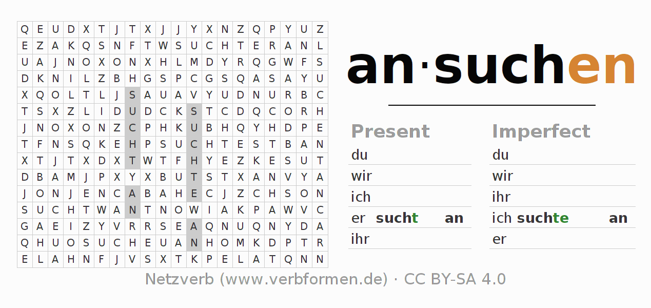 Instruction: Form the verb ansuchen and find it in the puzzle. Or recognize the flected form of ansuchen in the riddle and assign it to the correct verb form. Umlauts and ß are described as oe, ae and ue an ss.The solution is at the bottom of the page.