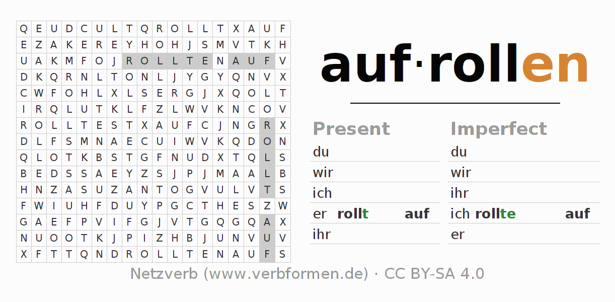 The word search puzzle for aufrollen or short word search is used to playfully learn German conjugation. First of all, the individual verb forms of the verb aufrollen must be created in order to find them in the letter grid. The reverse way is also possible. If one finds a flected verb in the search word puzzle, it is necessary to find out which verb form can be assigned. For printing and downloading, there is a PDF version or an image. There are also many more worksheets for the verb aufrollen. All materials are available as Open Educational Resources (OER) under license CC BY- SA 4.0 and can be used free of charge.