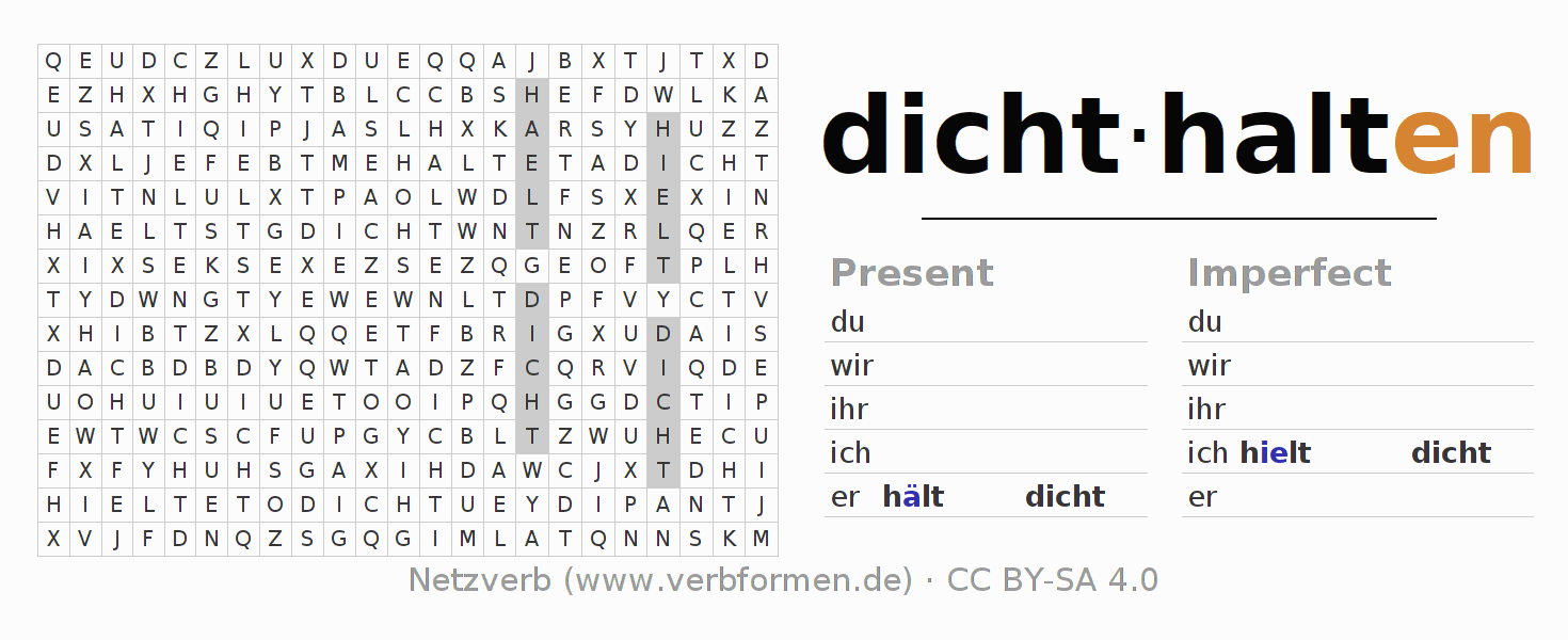 The word search puzzle for dichthalten or short word search is used to playfully learn German conjugation. First of all, the individual verb forms of the verb dichthalten must be created in order to find them in the letter grid. The reverse way is also possible. If one finds a flected verb in the search word puzzle, it is necessary to find out which verb form can be assigned. For printing and downloading, there is a PDF version or an image. There are also many more worksheets for the verb dichthalten. All materials are available as Open Educational Resources (OER) under license CC BY- SA 4.0 and can be used free of charge.