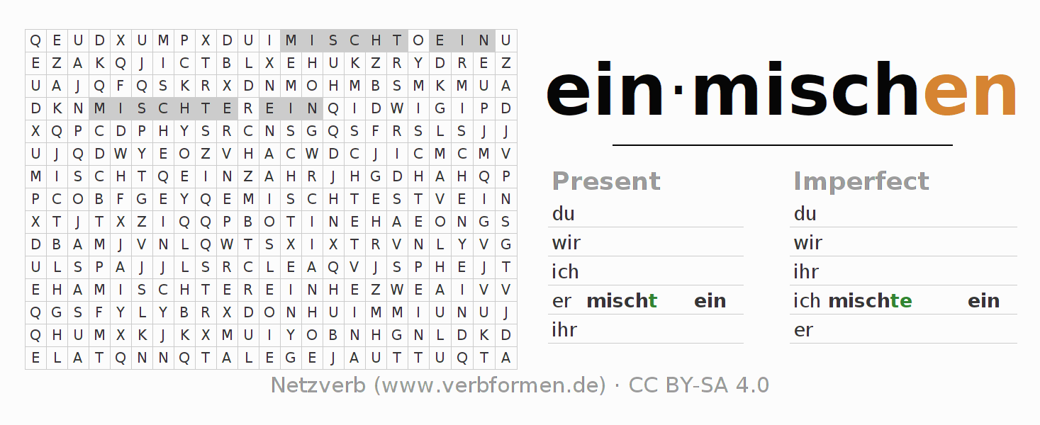 The word search puzzle for einmischen or short word search is used to playfully learn German conjugation. First of all, the individual verb forms of the verb einmischen must be created in order to find them in the letter grid. The reverse way is also possible. If one finds a flected verb in the search word puzzle, it is necessary to find out which verb form can be assigned. For printing and downloading, there is a PDF version or an image. There are also many more worksheets for the verb einmischen. All materials are available as Open Educational Resources (OER) under license CC BY- SA 4.0 and can be used free of charge.