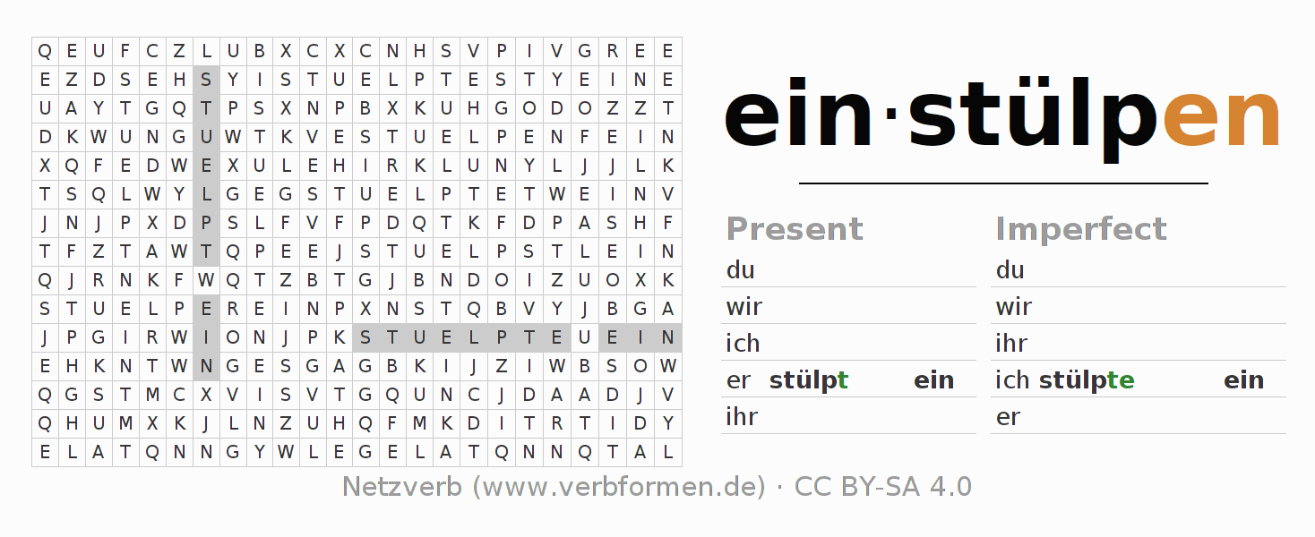 The word search puzzle for einstülpen or short word search is used to playfully learn German conjugation. First of all, the individual verb forms of the verb einstülpen must be created in order to find them in the letter grid. The reverse way is also possible. If one finds a flected verb in the search word puzzle, it is necessary to find out which verb form can be assigned. For printing and downloading, there is a PDF version or an image. There are also many more worksheets for the verb einstülpen. All materials are available as Open Educational Resources (OER) under license CC BY- SA 4.0 and can be used free of charge.