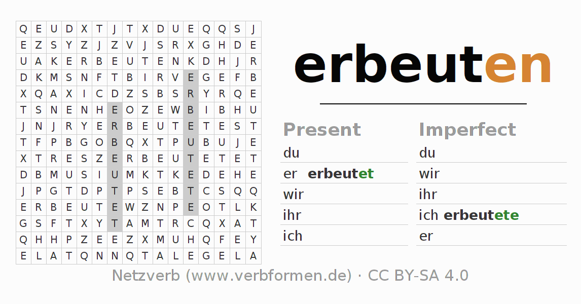 The word search puzzle for erbeuten or short word search is used to playfully learn German conjugation. First of all, the individual verb forms of the verb erbeuten must be created in order to find them in the letter grid. The reverse way is also possible. If one finds a flected verb in the search word puzzle, it is necessary to find out which verb form can be assigned. For printing and downloading, there is a PDF version or an image. There are also many more worksheets for the verb erbeuten. All materials are available as Open Educational Resources (OER) under license CC BY- SA 4.0 and can be used free of charge.