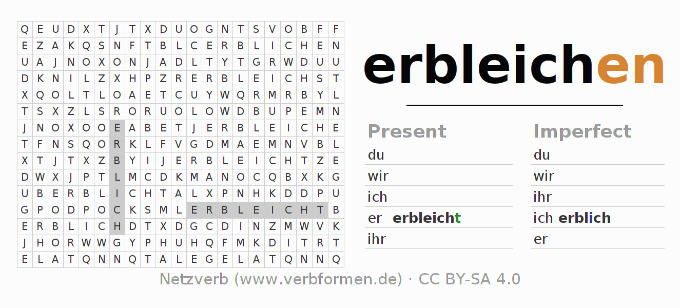 Instruction: Form the verb erbleichen and find it in the puzzle. Or recognize the flected form of erbleichen in the riddle and assign it to the correct verb form. Umlauts and ß are described as oe, ae and ue an ss.The solution is at the bottom of the page.