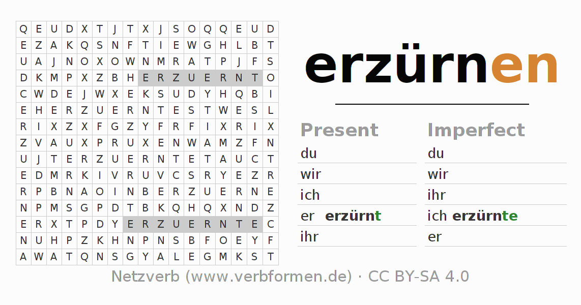 The word search puzzle for erzürnen or short word search is used to playfully learn German conjugation. First of all, the individual verb forms of the verb erzürnen (ist) must be created in order to find them in the letter grid. The reverse way is also possible. If one finds a flected verb in the search word puzzle, it is necessary to find out which verb form can be assigned. For printing and downloading, there is a PDF version or an image. There are also many more worksheets for the verb erzürnen. All materials are available as Open Educational Resources (OER) under license CC BY- SA 4.0 and can be used free of charge.