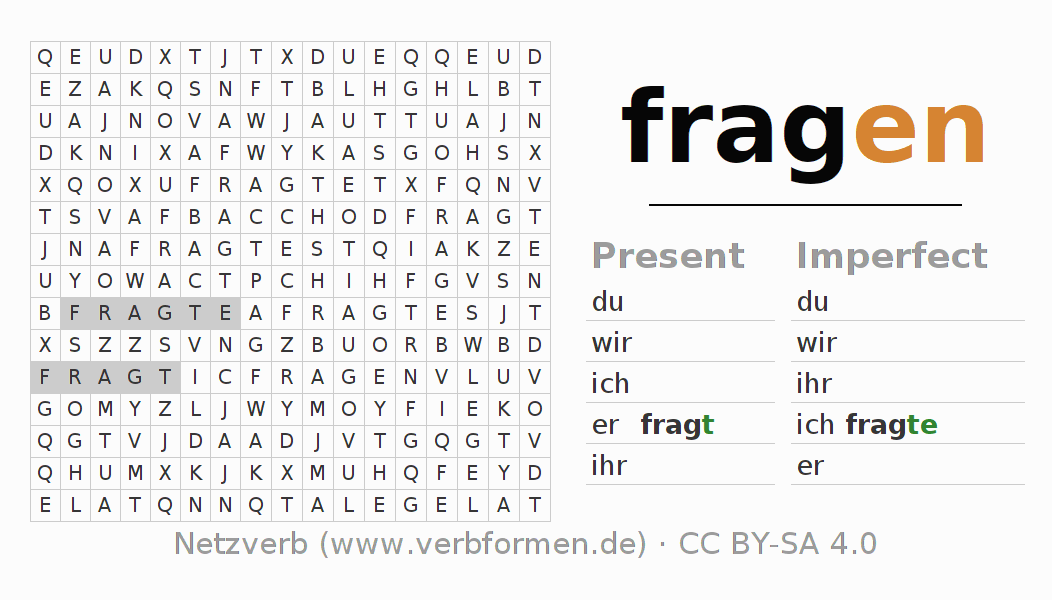 The word search puzzle for fragen or short word search is used to playfully learn German conjugation. First of all, the individual verb forms of the verb fragen (regelm) must be created in order to find them in the letter grid. The reverse way is also possible. If one finds a flected verb in the search word puzzle, it is necessary to find out which verb form can be assigned. For printing and downloading, there is a PDF version or an image. There are also many more worksheets for the verb fragen. All materials are available as Open Educational Resources (OER) under license CC BY- SA 4.0 and can be used free of charge.