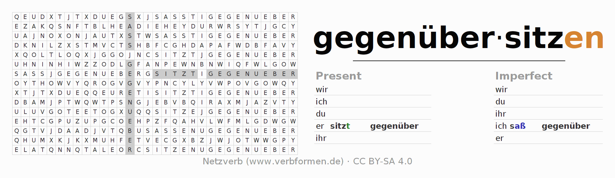 Instruction: Form the verb gegenübersitzen and find it in the puzzle. Or recognize the flected form of gegenübersitzen in the riddle and assign it to the correct verb form. Umlauts and ß are described as oe, ae and ue an ss.The solution is at the bottom of the page.