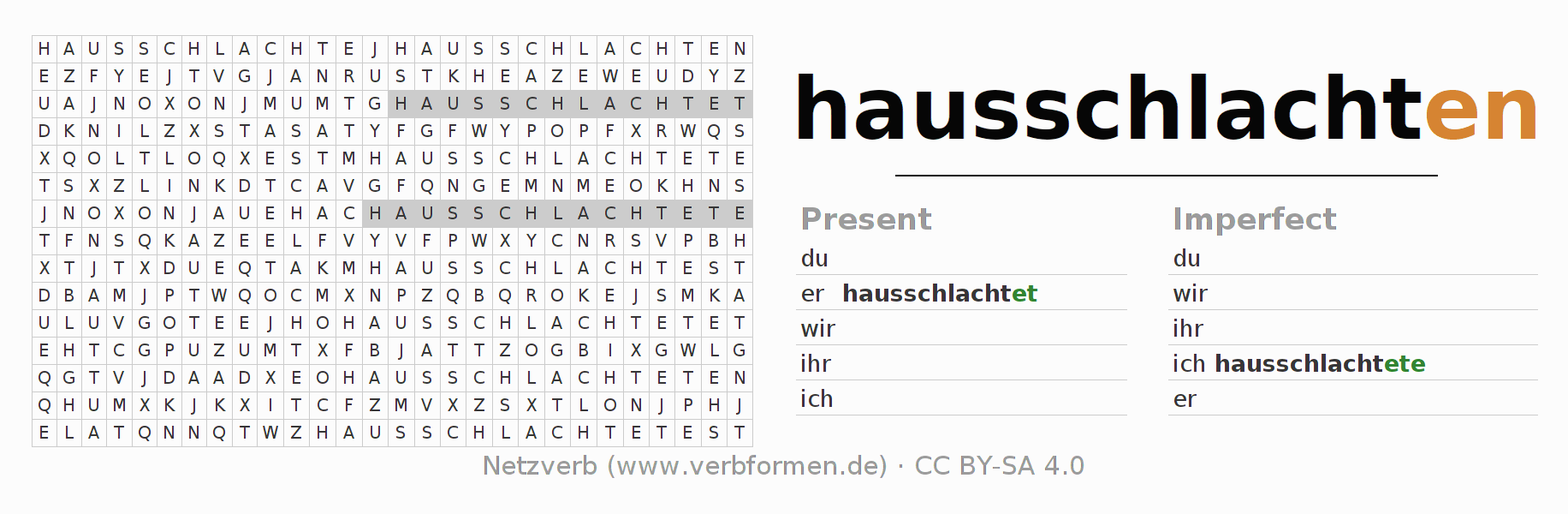 The word search puzzle for hausschlachten or short word search is used to playfully learn German conjugation. First of all, the individual verb forms of the verb hausschlachten must be created in order to find them in the letter grid. The reverse way is also possible. If one finds a flected verb in the search word puzzle, it is necessary to find out which verb form can be assigned. For printing and downloading, there is a PDF version or an image. There are also many more worksheets for the verb hausschlachten. All materials are available as Open Educational Resources (OER) under license CC BY- SA 4.0 and can be used free of charge.