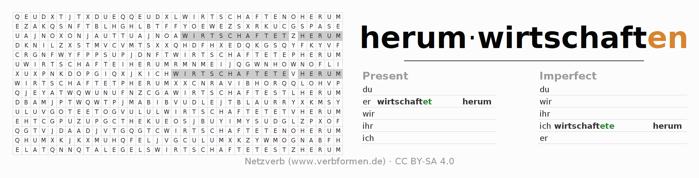 The word search puzzle for herumwirtschaften or short word search is used to playfully learn German conjugation. First of all, the individual verb forms of the verb herumwirtschaften must be created in order to find them in the letter grid. The reverse way is also possible. If one finds a flected verb in the search word puzzle, it is necessary to find out which verb form can be assigned. For printing and downloading, there is a PDF version or an image. There are also many more worksheets for the verb herumwirtschaften. All materials are available as Open Educational Resources (OER) under license CC BY- SA 4.0 and can be used free of charge.