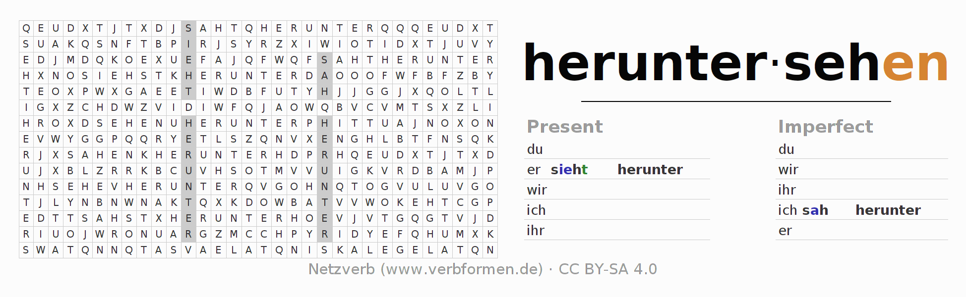 The word search puzzle for heruntersehen or short word search is used to playfully learn German conjugation. First of all, the individual verb forms of the verb heruntersehen must be created in order to find them in the letter grid. The reverse way is also possible. If one finds a flected verb in the search word puzzle, it is necessary to find out which verb form can be assigned. For printing and downloading, there is a PDF version or an image. There are also many more worksheets for the verb heruntersehen. All materials are available as Open Educational Resources (OER) under license CC BY- SA 4.0 and can be used free of charge.