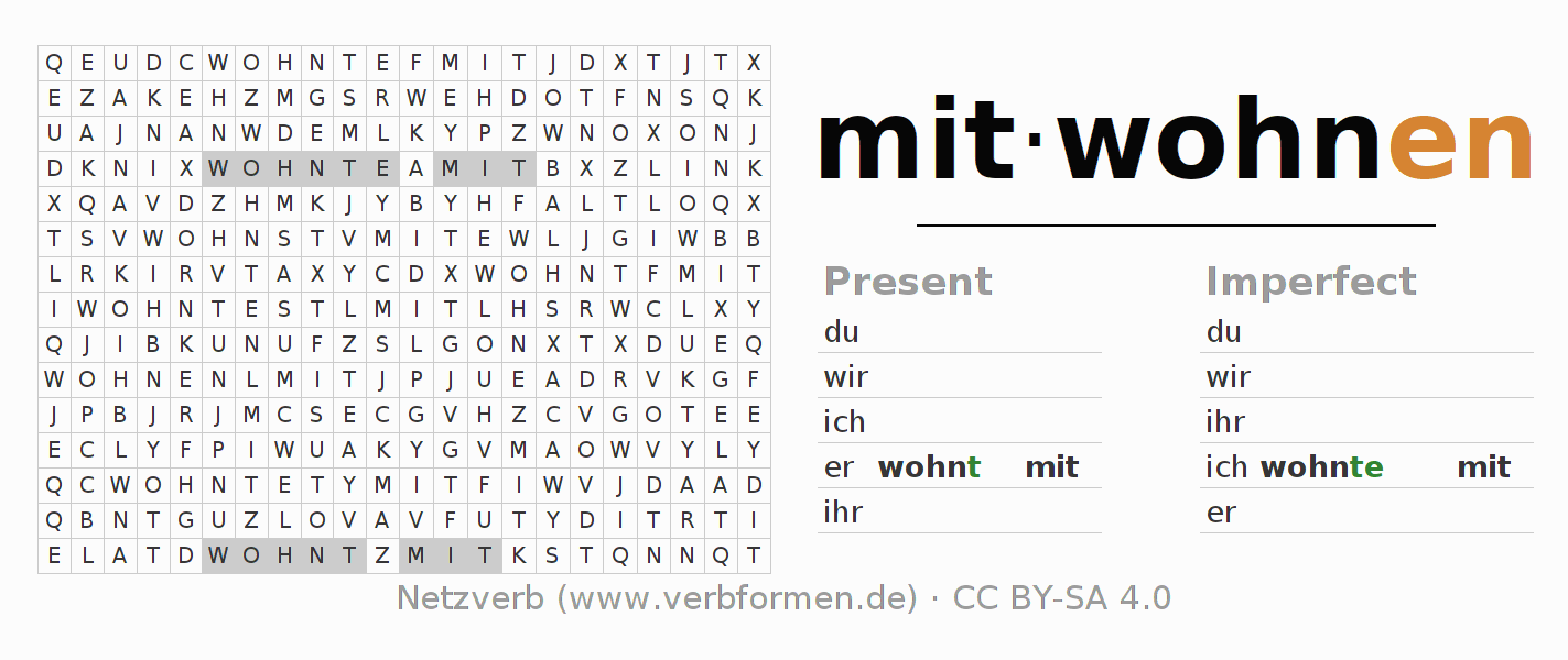 The word search puzzle for mitwohnen or short word search is used to playfully learn German conjugation. First of all, the individual verb forms of the verb mitwohnen must be created in order to find them in the letter grid. The reverse way is also possible. If one finds a flected verb in the search word puzzle, it is necessary to find out which verb form can be assigned. For printing and downloading, there is a PDF version or an image. There are also many more worksheets for the verb mitwohnen. All materials are available as Open Educational Resources (OER) under license CC BY- SA 4.0 and can be used free of charge.