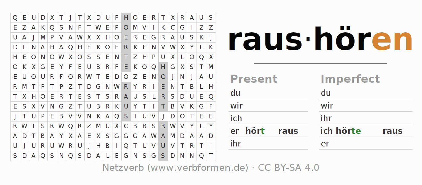 The word search puzzle for raushören or short word search is used to playfully learn German conjugation. First of all, the individual verb forms of the verb raushören must be created in order to find them in the letter grid. The reverse way is also possible. If one finds a flected verb in the search word puzzle, it is necessary to find out which verb form can be assigned. For printing and downloading, there is a PDF version or an image. There are also many more worksheets for the verb raushören. All materials are available as Open Educational Resources (OER) under license CC BY- SA 4.0 and can be used free of charge.