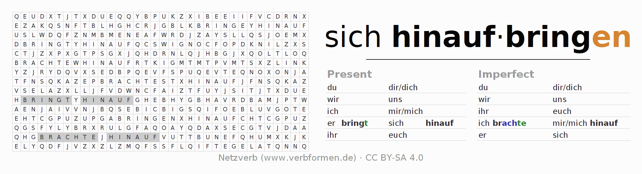 The word search puzzle for hinaufbringen or short word search is used to playfully learn German conjugation. First of all, the individual verb forms of the verb sich hinaufbringen must be created in order to find them in the letter grid. The reverse way is also possible. If one finds a flected verb in the search word puzzle, it is necessary to find out which verb form can be assigned. For printing and downloading, there is a PDF version or an image. There are also many more worksheets for the verb hinaufbringen. All materials are available as Open Educational Resources (OER) under license CC BY- SA 4.0 and can be used free of charge.