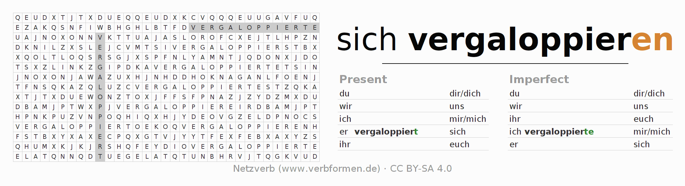 The word search puzzle for vergaloppieren or short word search is used to playfully learn German conjugation. First of all, the individual verb forms of the verb sich vergaloppieren must be created in order to find them in the letter grid. The reverse way is also possible. If one finds a flected verb in the search word puzzle, it is necessary to find out which verb form can be assigned. For printing and downloading, there is a PDF version or an image. There are also many more worksheets for the verb vergaloppieren. All materials are available as Open Educational Resources (OER) under license CC BY- SA 4.0 and can be used free of charge.