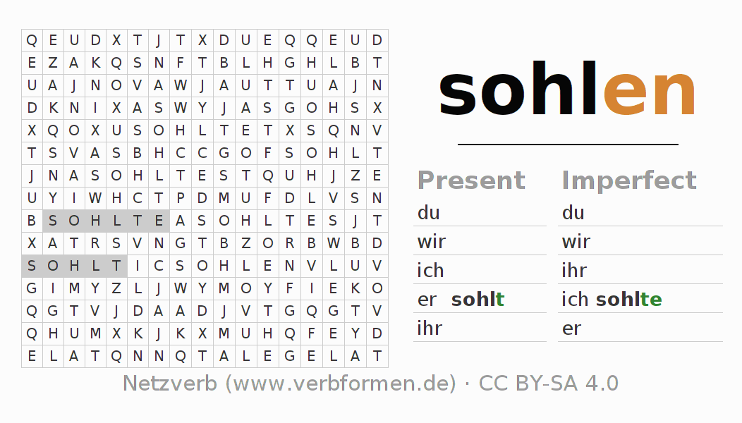 The word search puzzle for sohlen or short word search is used to playfully learn German conjugation. First of all, the individual verb forms of the verb sohlen must be created in order to find them in the letter grid. The reverse way is also possible. If one finds a flected verb in the search word puzzle, it is necessary to find out which verb form can be assigned. For printing and downloading, there is a PDF version or an image. There are also many more worksheets for the verb sohlen. All materials are available as Open Educational Resources (OER) under license CC BY- SA 4.0 and can be used free of charge.