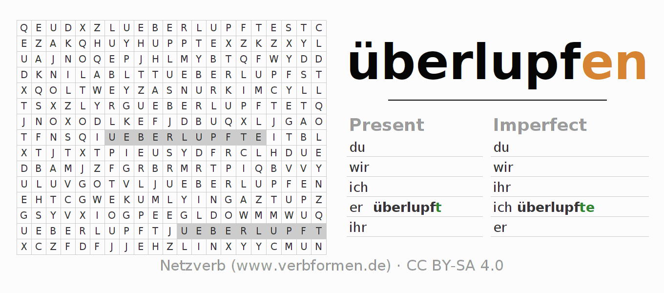 The word search puzzle for überlupfen or short word search is used to playfully learn German conjugation. First of all, the individual verb forms of the verb überlupfen must be created in order to find them in the letter grid. The reverse way is also possible. If one finds a flected verb in the search word puzzle, it is necessary to find out which verb form can be assigned. For printing and downloading, there is a PDF version or an image. There are also many more worksheets for the verb überlupfen. All materials are available as Open Educational Resources (OER) under license CC BY- SA 4.0 and can be used free of charge.