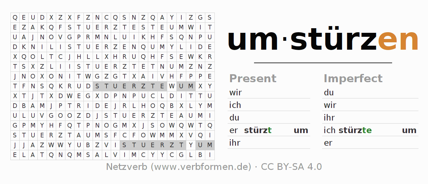 The word search puzzle for umstürzen or short word search is used to playfully learn German conjugation. First of all, the individual verb forms of the verb umstürzen (ist) must be created in order to find them in the letter grid. The reverse way is also possible. If one finds a flected verb in the search word puzzle, it is necessary to find out which verb form can be assigned. For printing and downloading, there is a PDF version or an image. There are also many more worksheets for the verb umstürzen. All materials are available as Open Educational Resources (OER) under license CC BY- SA 4.0 and can be used free of charge.