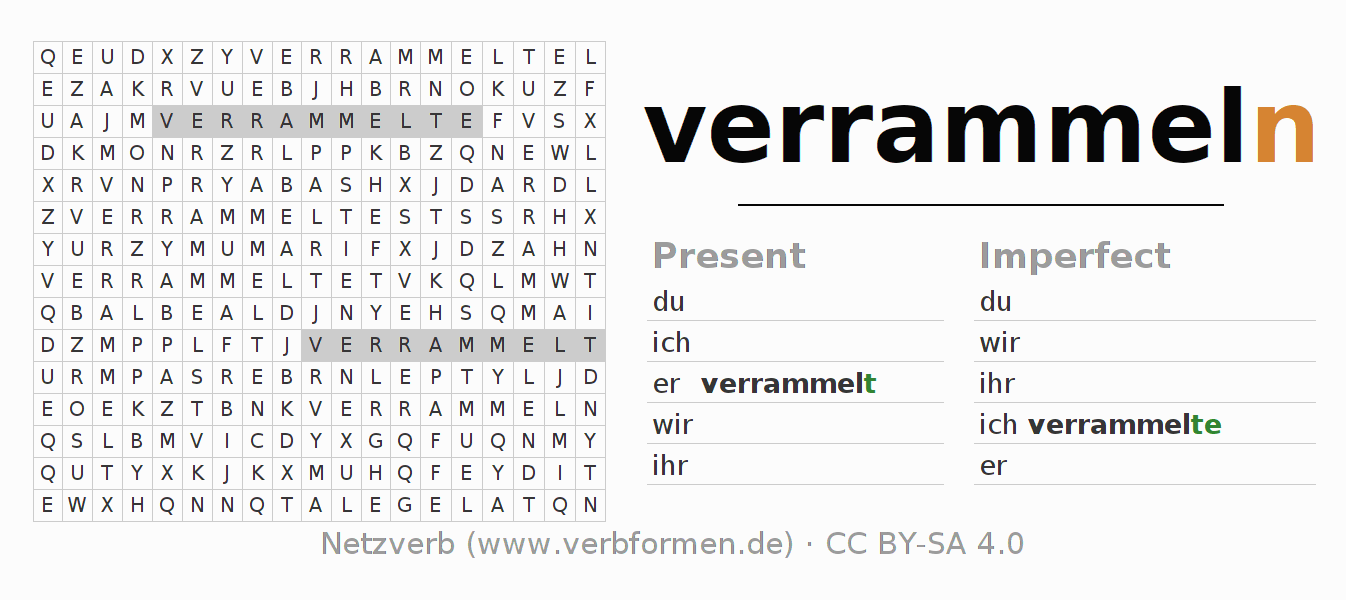 Instruction: Form the verb verrammeln and find it in the puzzle. Or recognize the flected form of verrammeln in the riddle and assign it to the correct verb form. Umlauts and ß are described as oe, ae and ue an ss.The solution is at the bottom of the page.
