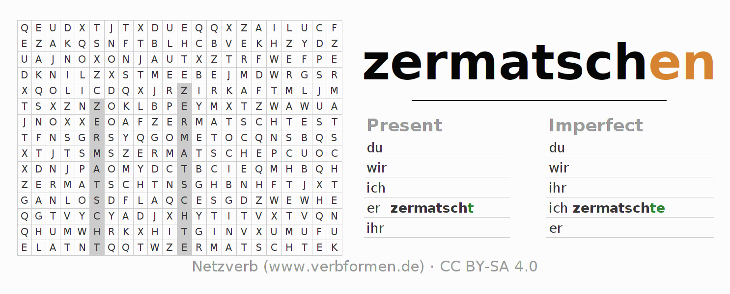 The word search puzzle for zermatschen or short word search is used to playfully learn German conjugation. First of all, the individual verb forms of the verb zermatschen must be created in order to find them in the letter grid. The reverse way is also possible. If one finds a flected verb in the search word puzzle, it is necessary to find out which verb form can be assigned. For printing and downloading, there is a PDF version or an image. There are also many more worksheets for the verb zermatschen. All materials are available as Open Educational Resources (OER) under license CC BY- SA 4.0 and can be used free of charge.