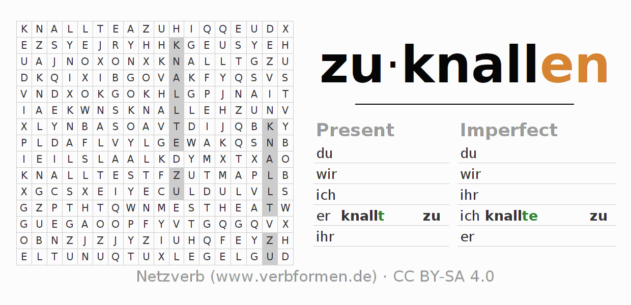 The word search puzzle for zuknallen or short word search is used to playfully learn German conjugation. First of all, the individual verb forms of the verb zuknallen (ist) must be created in order to find them in the letter grid. The reverse way is also possible. If one finds a flected verb in the search word puzzle, it is necessary to find out which verb form can be assigned. For printing and downloading, there is a PDF version or an image. There are also many more worksheets for the verb zuknallen. All materials are available as Open Educational Resources (OER) under license CC BY- SA 4.0 and can be used free of charge.