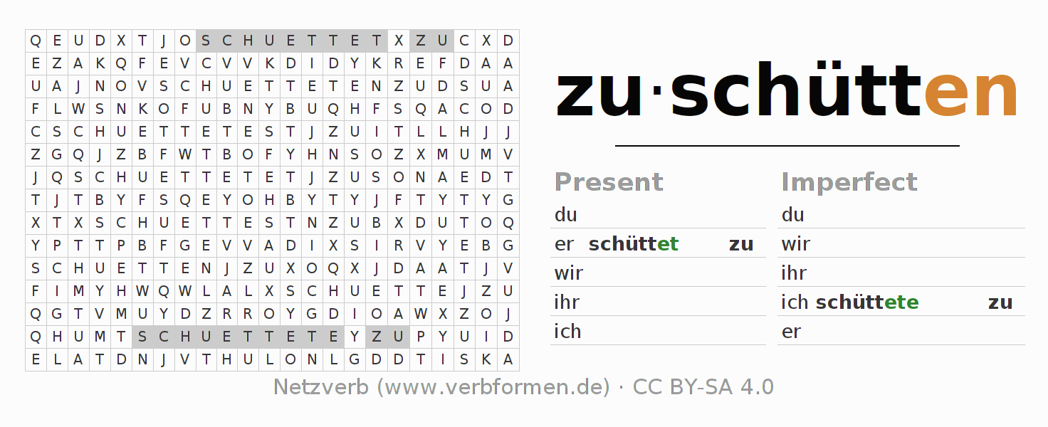 The word search puzzle for zuschütten or short word search is used to playfully learn German conjugation. First of all, the individual verb forms of the verb zuschütten must be created in order to find them in the letter grid. The reverse way is also possible. If one finds a flected verb in the search word puzzle, it is necessary to find out which verb form can be assigned. For printing and downloading, there is a PDF version or an image. There are also many more worksheets for the verb zuschütten. All materials are available as Open Educational Resources (OER) under license CC BY- SA 4.0 and can be used free of charge.