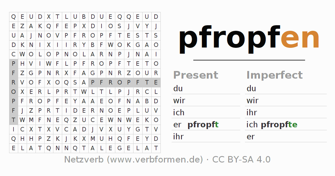 Instruction: Form the verb pfropfen and find it in the puzzle. Or recognize the flected form of pfropfen in the riddle and assign it to the correct verb form. Umlauts and ß are described as oe, ae and ue an ss.The solution is at the bottom of the page.