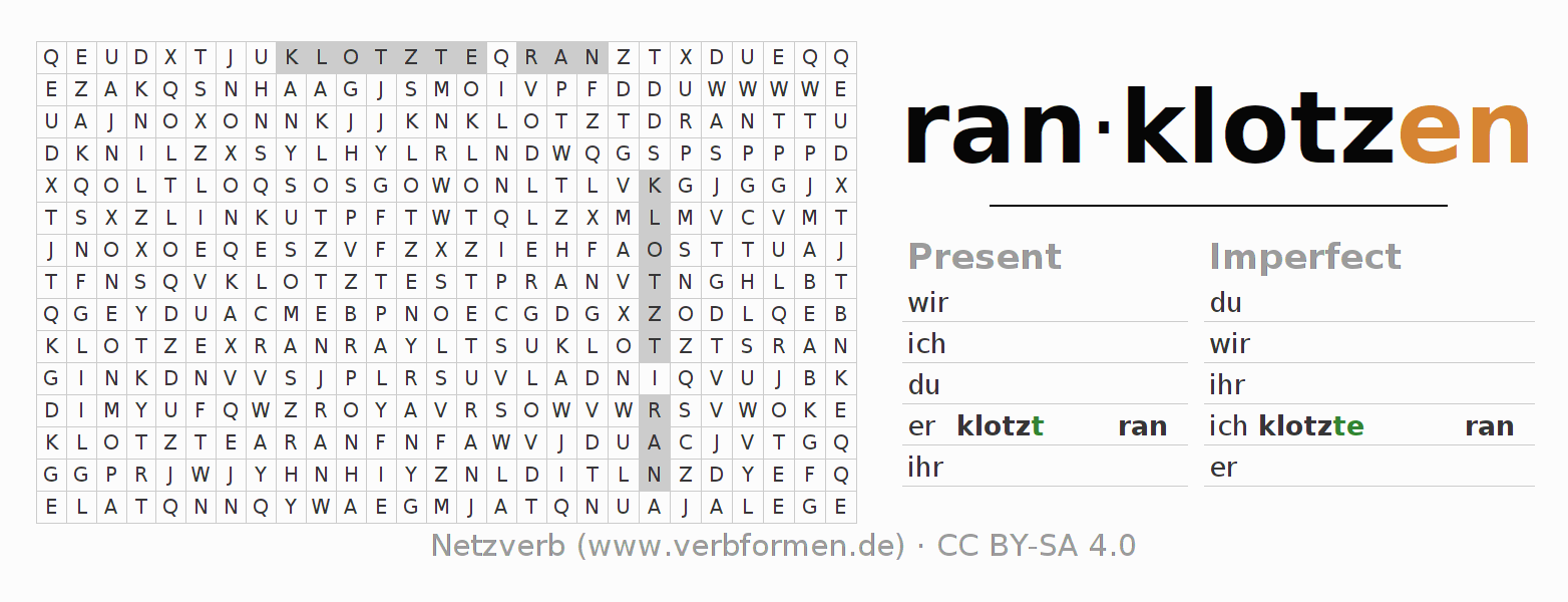 The word search puzzle for ranklotzen or short word search is used to playfully learn German conjugation. First of all, the individual verb forms of the verb ranklotzen must be created in order to find them in the letter grid. The reverse way is also possible. If one finds a flected verb in the search word puzzle, it is necessary to find out which verb form can be assigned. For printing and downloading, there is a PDF version or an image. There are also many more worksheets for the verb ranklotzen. All materials are available as Open Educational Resources (OER) under license CC BY- SA 4.0 and can be used free of charge.
