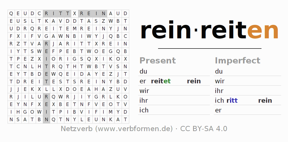 Instruction: Form the verb reinreiten and find it in the puzzle. Or recognize the flected form of reinreiten in the riddle and assign it to the correct verb form. Umlauts and ß are described as oe, ae and ue an ss.The solution is at the bottom of the page.