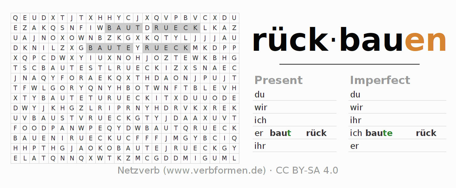 The word search puzzle for rückbauen or short word search is used to playfully learn German conjugation. First of all, the individual verb forms of the verb rückbauen must be created in order to find them in the letter grid. The reverse way is also possible. If one finds a flected verb in the search word puzzle, it is necessary to find out which verb form can be assigned. For printing and downloading, there is a PDF version or an image. There are also many more worksheets for the verb rückbauen. All materials are available as Open Educational Resources (OER) under license CC BY- SA 4.0 and can be used free of charge.