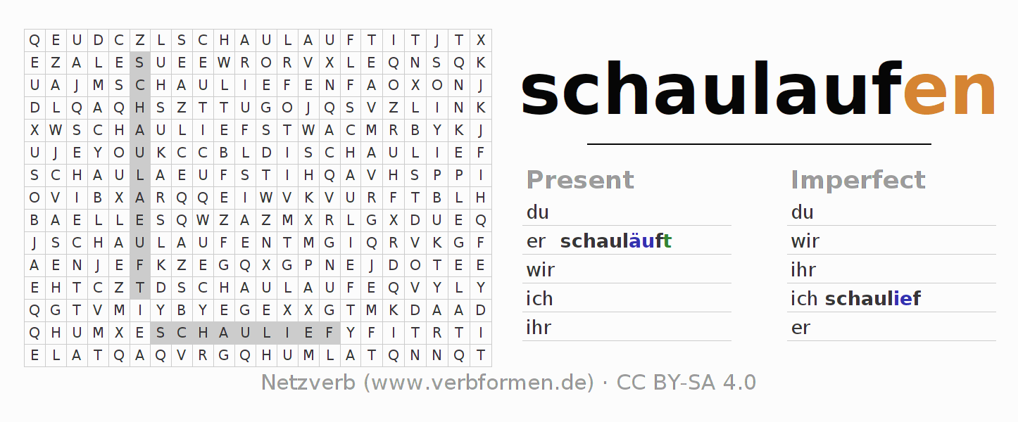 The word search puzzle for schaulaufen or short word search is used to playfully learn German conjugation. First of all, the individual verb forms of the verb schaulaufen must be created in order to find them in the letter grid. The reverse way is also possible. If one finds a flected verb in the search word puzzle, it is necessary to find out which verb form can be assigned. For printing and downloading, there is a PDF version or an image. There are also many more worksheets for the verb schaulaufen. All materials are available as Open Educational Resources (OER) under license CC BY- SA 4.0 and can be used free of charge.