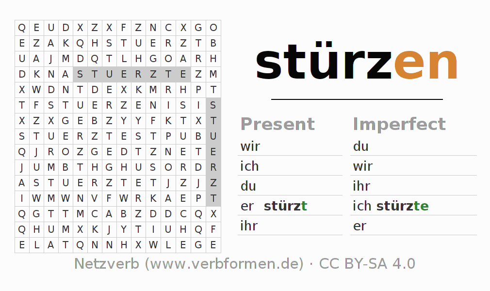 Instruction: Form the verb stürzen and find it in the puzzle. Or recognize the flected form of stürzen in the riddle and assign it to the correct verb form. Umlauts and ß are described as oe, ae and ue an ss.The solution is at the bottom of the page.