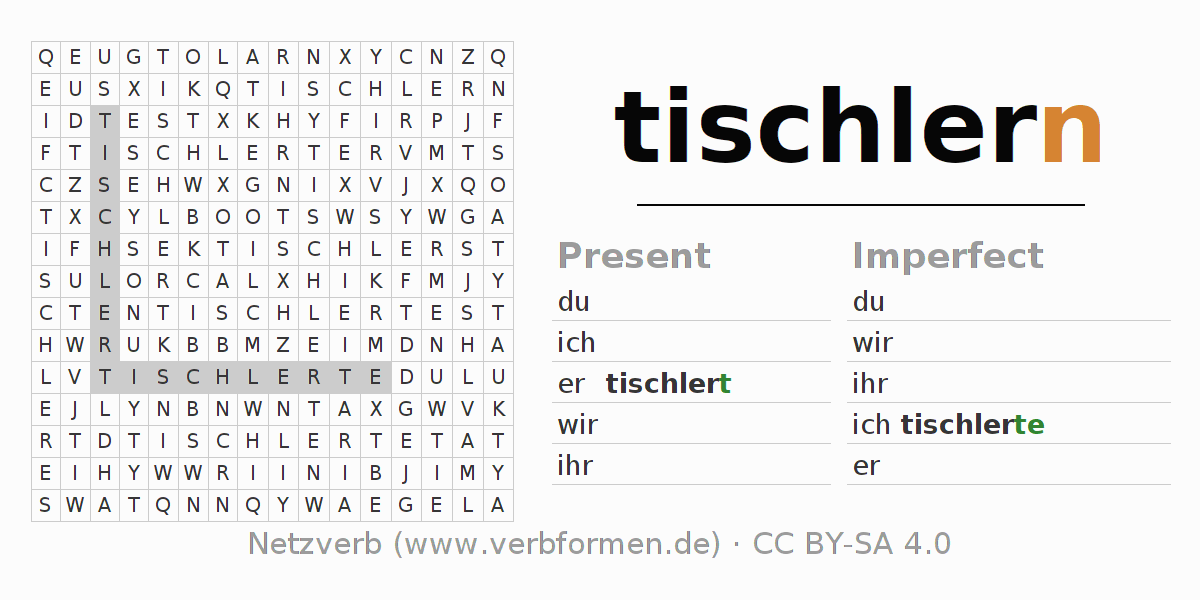 The word search puzzle for tischlern or short word search is used to playfully learn German conjugation. First of all, the individual verb forms of the verb tischlern must be created in order to find them in the letter grid. The reverse way is also possible. If one finds a flected verb in the search word puzzle, it is necessary to find out which verb form can be assigned. For printing and downloading, there is a PDF version or an image. There are also many more worksheets for the verb tischlern. All materials are available as Open Educational Resources (OER) under license CC BY- SA 4.0 and can be used free of charge.