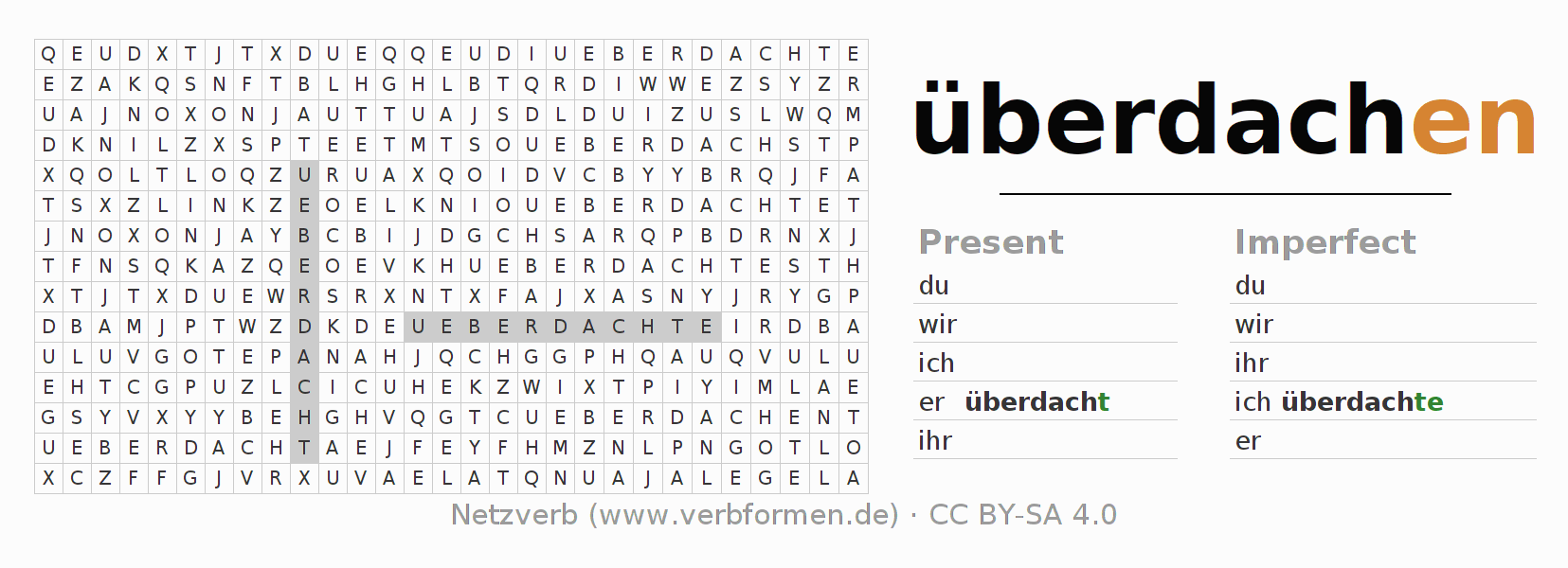 The word search puzzle for überdachen or short word search is used to playfully learn German conjugation. First of all, the individual verb forms of the verb überdachen must be created in order to find them in the letter grid. The reverse way is also possible. If one finds a flected verb in the search word puzzle, it is necessary to find out which verb form can be assigned. For printing and downloading, there is a PDF version or an image. There are also many more worksheets for the verb überdachen. All materials are available as Open Educational Resources (OER) under license CC BY- SA 4.0 and can be used free of charge.