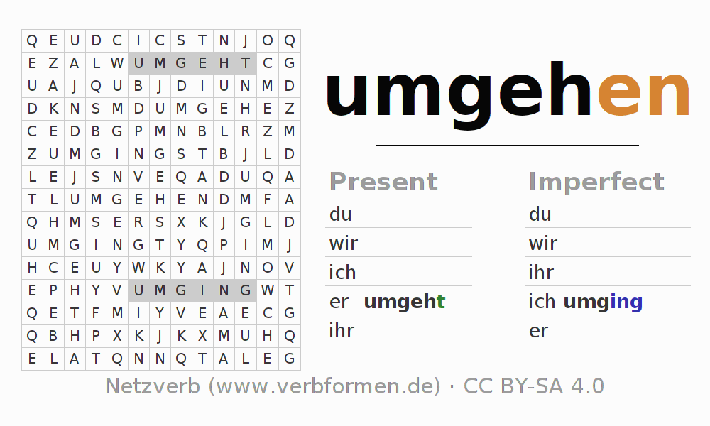Instruction: Form the verb umgehen and find it in the puzzle. Or recognize the flected form of umgehen in the riddle and assign it to the correct verb form. Umlauts and ß are described as oe, ae and ue an ss.The solution is at the bottom of the page.