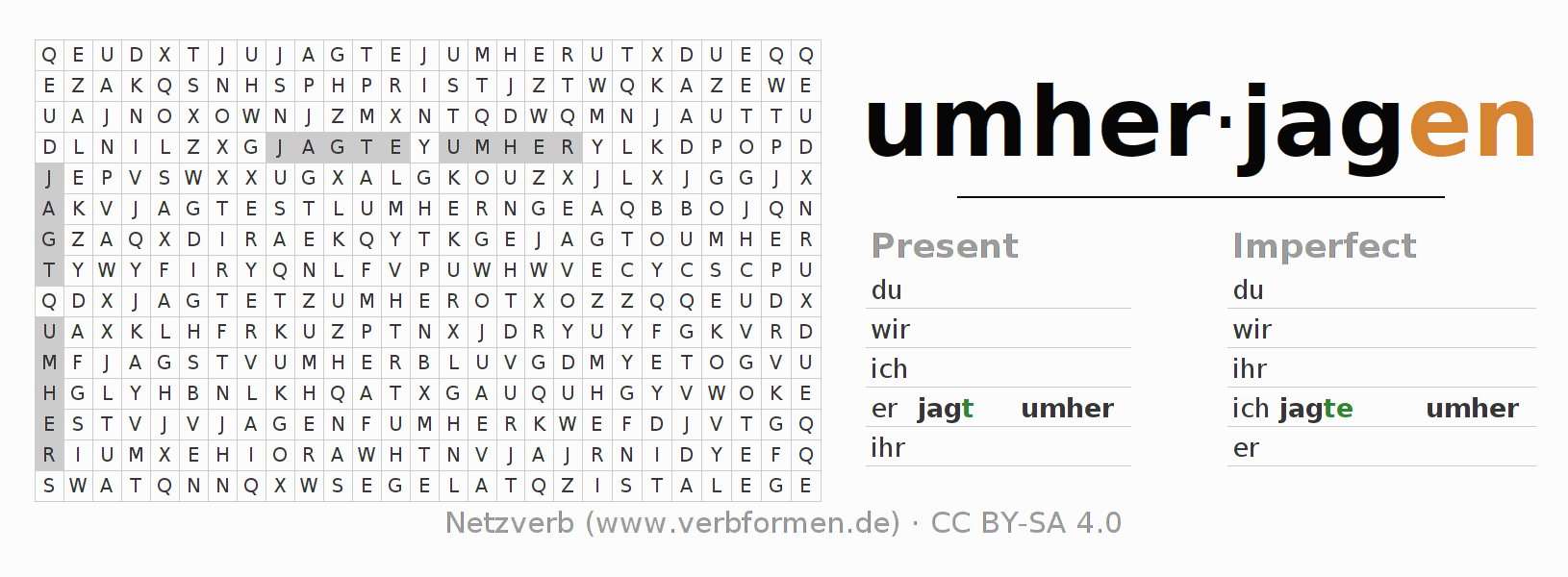 The word search puzzle for umherjagen or short word search is used to playfully learn German conjugation. First of all, the individual verb forms of the verb umherjagen must be created in order to find them in the letter grid. The reverse way is also possible. If one finds a flected verb in the search word puzzle, it is necessary to find out which verb form can be assigned. For printing and downloading, there is a PDF version or an image. There are also many more worksheets for the verb umherjagen. All materials are available as Open Educational Resources (OER) under license CC BY- SA 4.0 and can be used free of charge.
