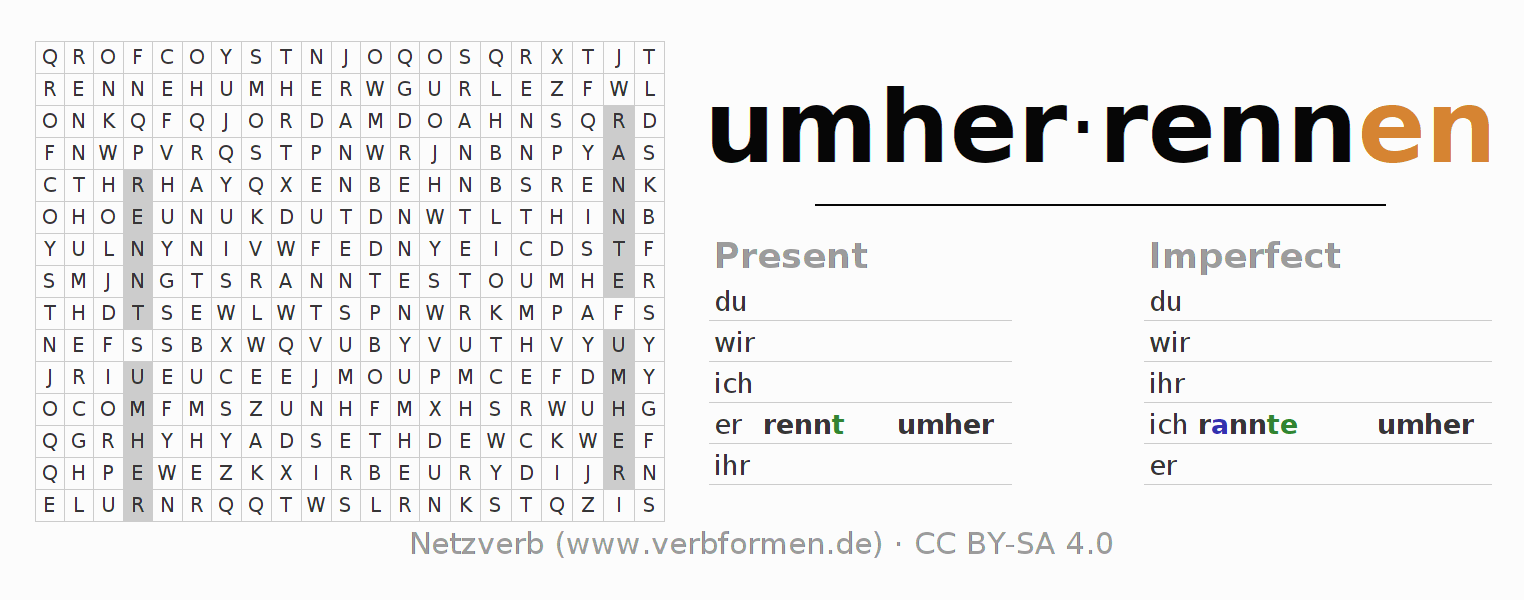 The word search puzzle for umherrennen or short word search is used to playfully learn German conjugation. First of all, the individual verb forms of the verb umherrennen must be created in order to find them in the letter grid. The reverse way is also possible. If one finds a flected verb in the search word puzzle, it is necessary to find out which verb form can be assigned. For printing and downloading, there is a PDF version or an image. There are also many more worksheets for the verb umherrennen. All materials are available as Open Educational Resources (OER) under license CC BY- SA 4.0 and can be used free of charge.