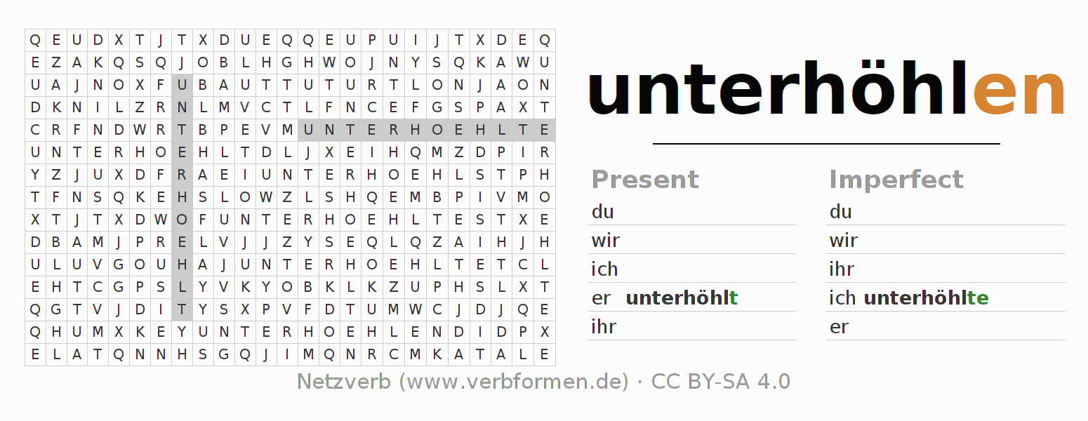 The word search puzzle for unterhöhlen or short word search is used to playfully learn German conjugation. First of all, the individual verb forms of the verb unterhöhlen must be created in order to find them in the letter grid. The reverse way is also possible. If one finds a flected verb in the search word puzzle, it is necessary to find out which verb form can be assigned. For printing and downloading, there is a PDF version or an image. There are also many more worksheets for the verb unterhöhlen. All materials are available as Open Educational Resources (OER) under license CC BY- SA 4.0 and can be used free of charge.