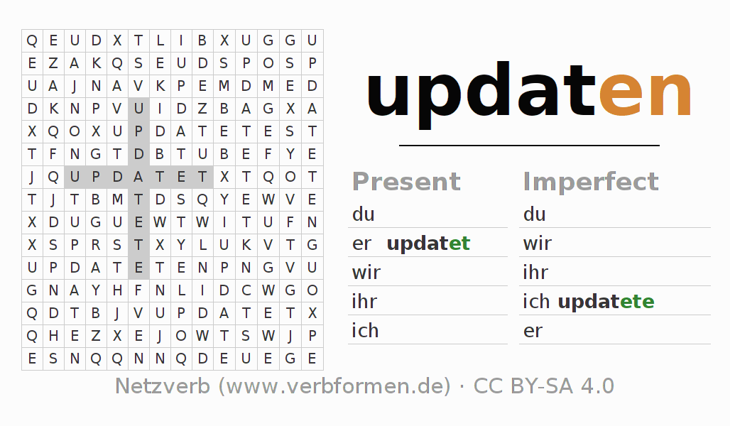The word search puzzle for updaten or short word search is used to playfully learn German conjugation. First of all, the individual verb forms of the verb updaten must be created in order to find them in the letter grid. The reverse way is also possible. If one finds a flected verb in the search word puzzle, it is necessary to find out which verb form can be assigned. For printing and downloading, there is a PDF version or an image. There are also many more worksheets for the verb updaten. All materials are available as Open Educational Resources (OER) under license CC BY- SA 4.0 and can be used free of charge.