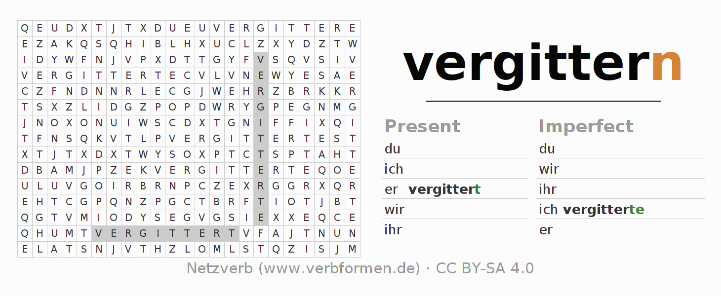 The word search puzzle for vergittern or short word search is used to playfully learn German conjugation. First of all, the individual verb forms of the verb vergittern must be created in order to find them in the letter grid. The reverse way is also possible. If one finds a flected verb in the search word puzzle, it is necessary to find out which verb form can be assigned. For printing and downloading, there is a PDF version or an image. There are also many more worksheets for the verb vergittern. All materials are available as Open Educational Resources (OER) under license CC BY- SA 4.0 and can be used free of charge.