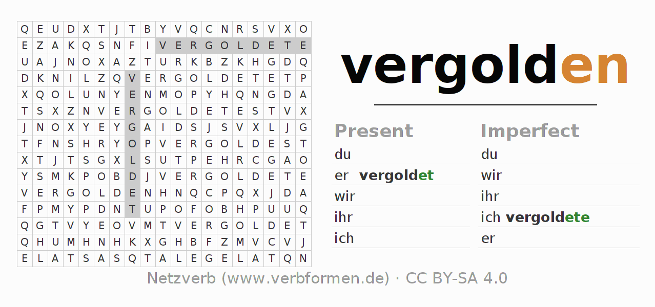 The word search puzzle for vergolden or short word search is used to playfully learn German conjugation. First of all, the individual verb forms of the verb vergolden must be created in order to find them in the letter grid. The reverse way is also possible. If one finds a flected verb in the search word puzzle, it is necessary to find out which verb form can be assigned. For printing and downloading, there is a PDF version or an image. There are also many more worksheets for the verb vergolden. All materials are available as Open Educational Resources (OER) under license CC BY- SA 4.0 and can be used free of charge.