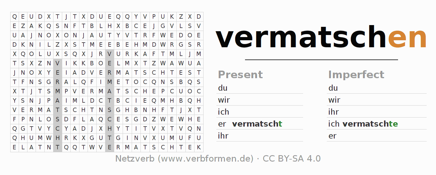 The word search puzzle for vermatschen or short word search is used to playfully learn German conjugation. First of all, the individual verb forms of the verb vermatschen must be created in order to find them in the letter grid. The reverse way is also possible. If one finds a flected verb in the search word puzzle, it is necessary to find out which verb form can be assigned. For printing and downloading, there is a PDF version or an image. There are also many more worksheets for the verb vermatschen. All materials are available as Open Educational Resources (OER) under license CC BY- SA 4.0 and can be used free of charge.