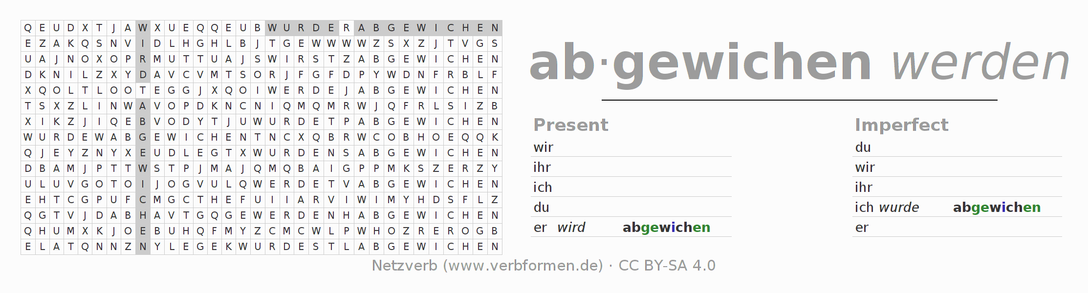 Word search puzzle for the conjugation of the German verb abweichen (unr) (ist)