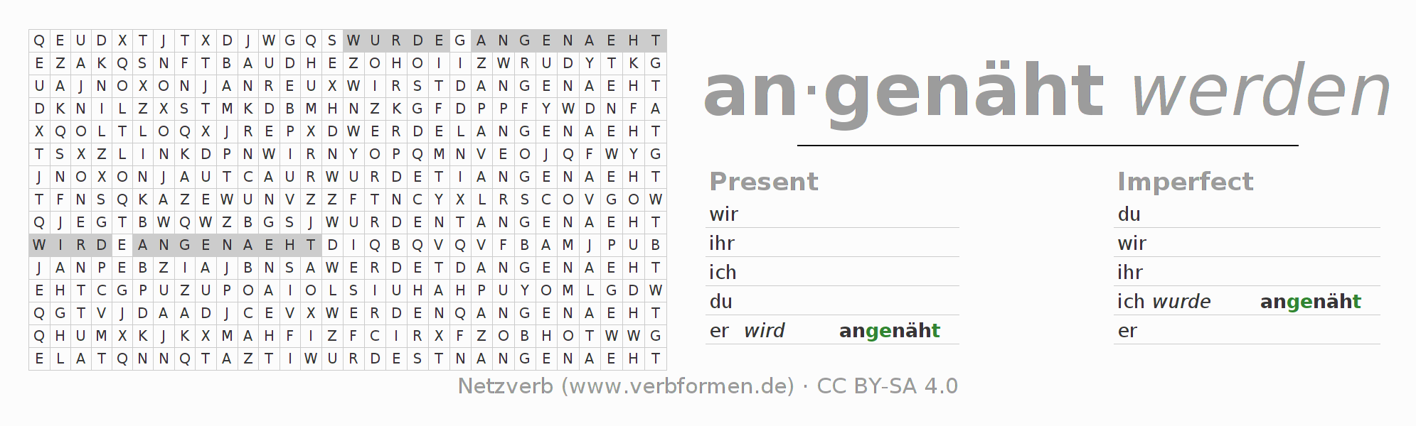 Word search puzzle for conjugation of German verb annähen 〈Passive〉