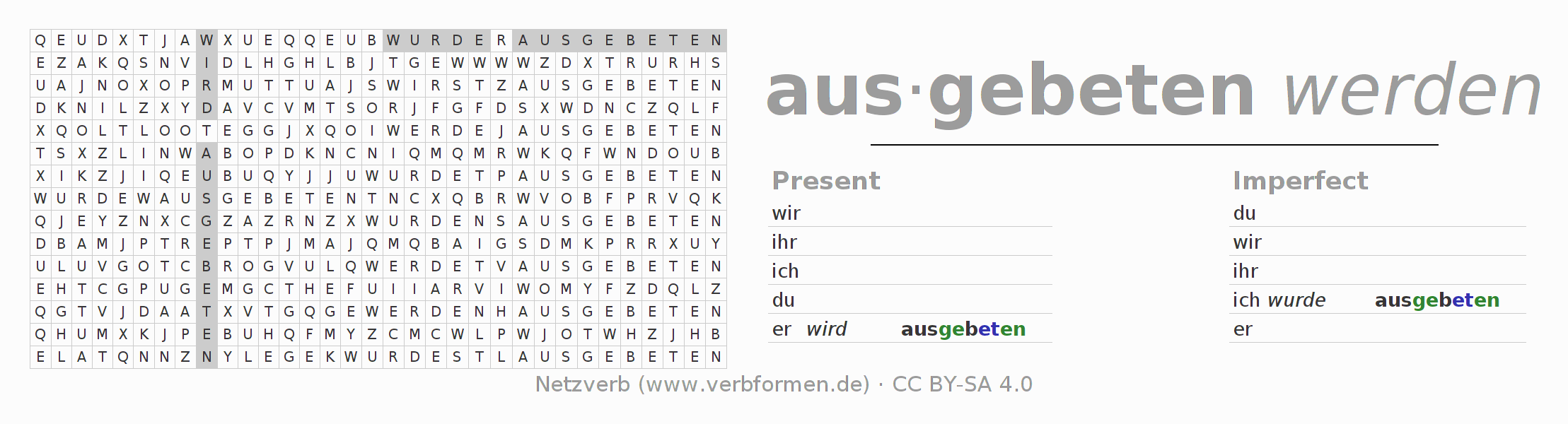 The word search puzzle for ausbitten or short word search is used to playfully learn German conjugation. First of all, the individual verb forms of the verb ausbitten must be created in order to find them in the letter grid. The reverse way is also possible. If one finds a flected verb in the search word puzzle, it is necessary to find out which verb form can be assigned. For printing and downloading, there is a PDF version or an image. There are also many more worksheets for the verb ausbitten. All materials are available as Open Educational Resources (OER) under license CC BY- SA 4.0 and can be used free of charge.